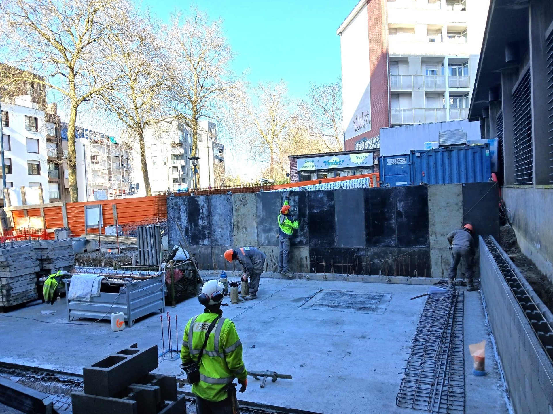 Parmi les spécificités de ce chantier, un bassin d'orage permettant de contrôler les rejets d'eau dans les EP de la Ville à l'aide d'un contrôleur de débit, est intégré au projet. Est également mise en place une poutre préfabriquée avec une engravure intégrée pour fixer la future enseigne.