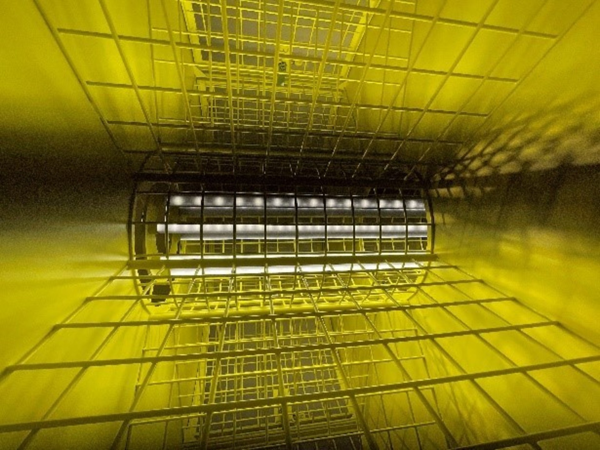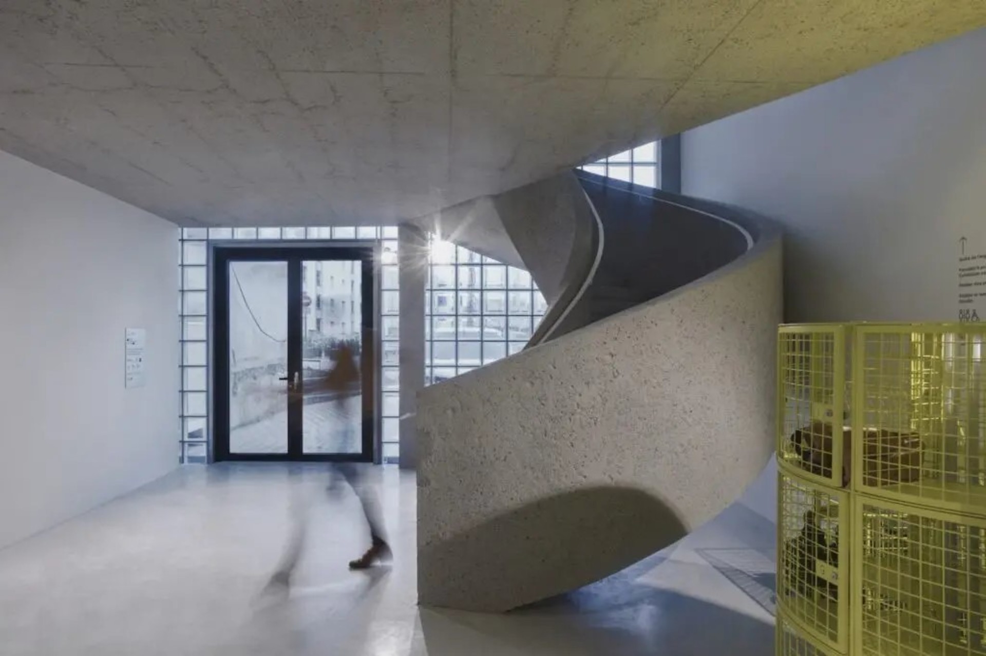 - Une cage d'ascenseur circulaire réalisée en blocs bancheurs bruts et sablés (STEPOC)